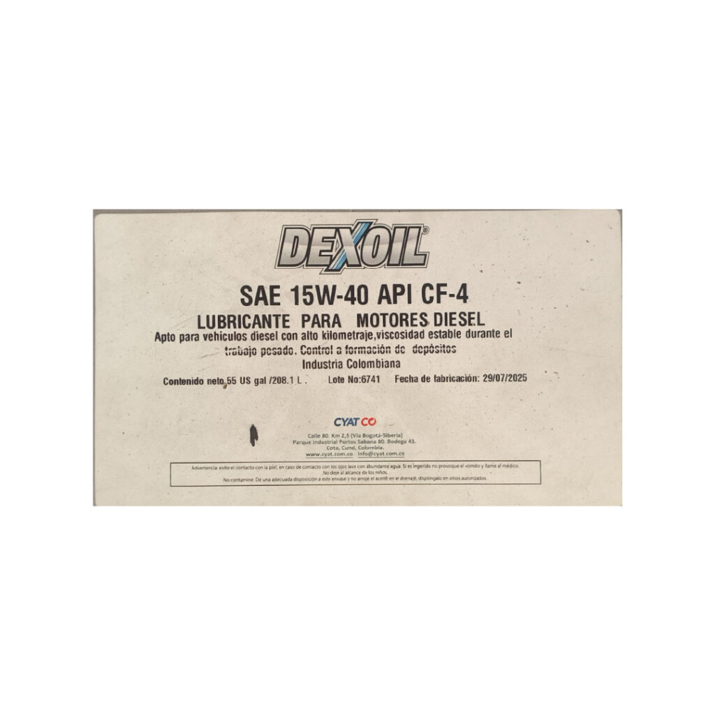Tambor 55 galones aceite motor diésel 15W-40 API CF-4 – DEXOIL; lubricante formulado para motores diésel de trabajo pesado, brindando protección contra desgaste, oxidación y depósitos.