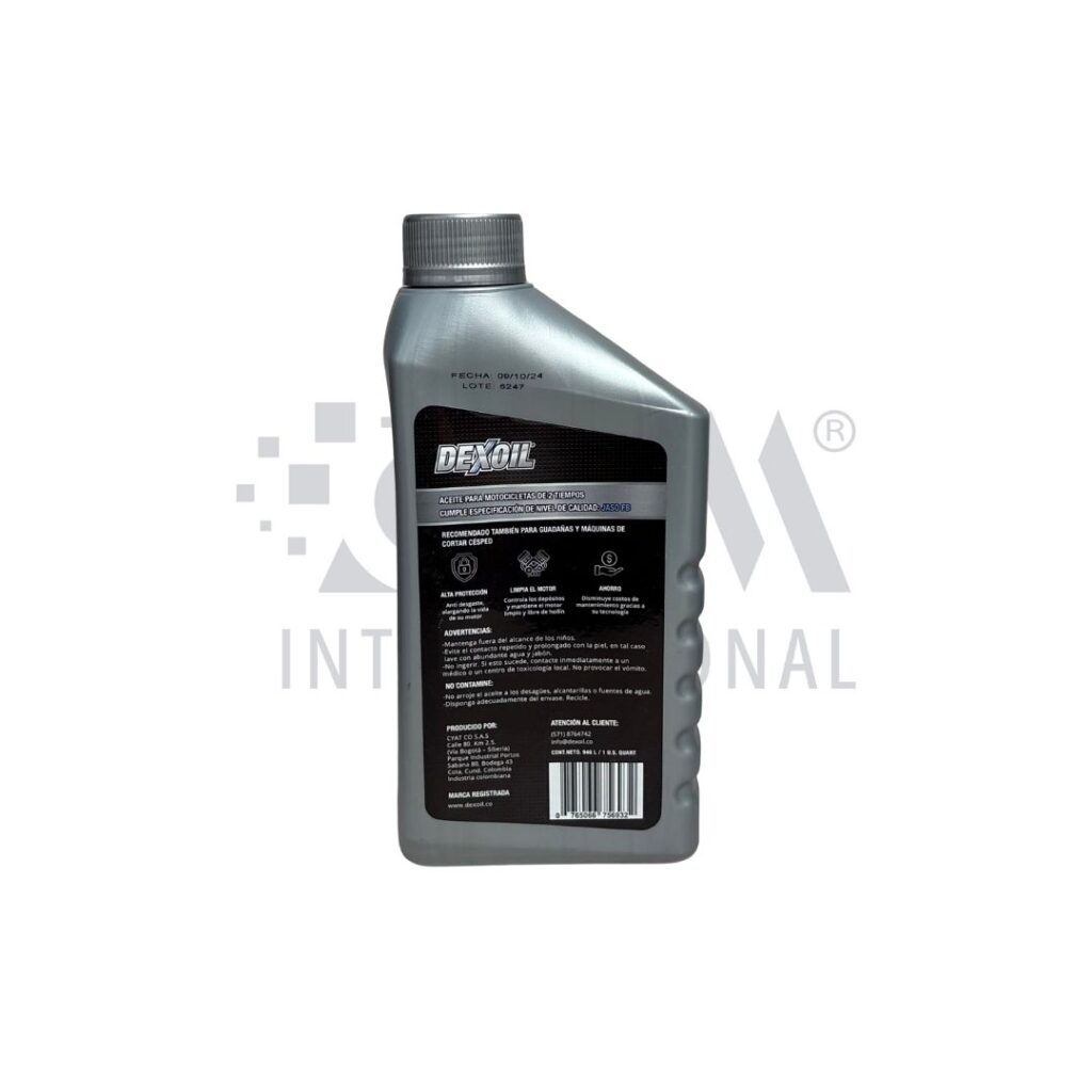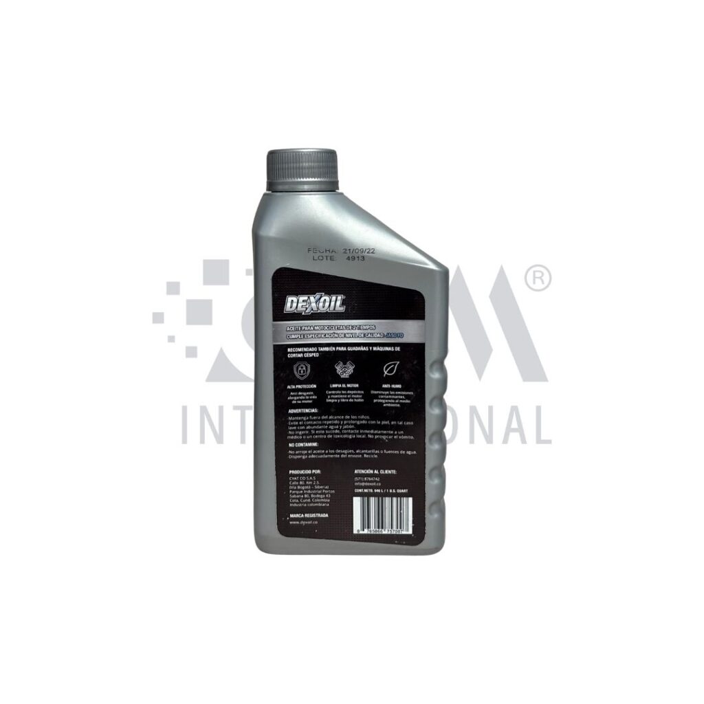 Aceite para motores 2 tiempos DEXOIL JASO FB, formulado para una combustión limpia, excelente lubricación y protección del motor. Ideal para motos, motosierras y equipos 2T.