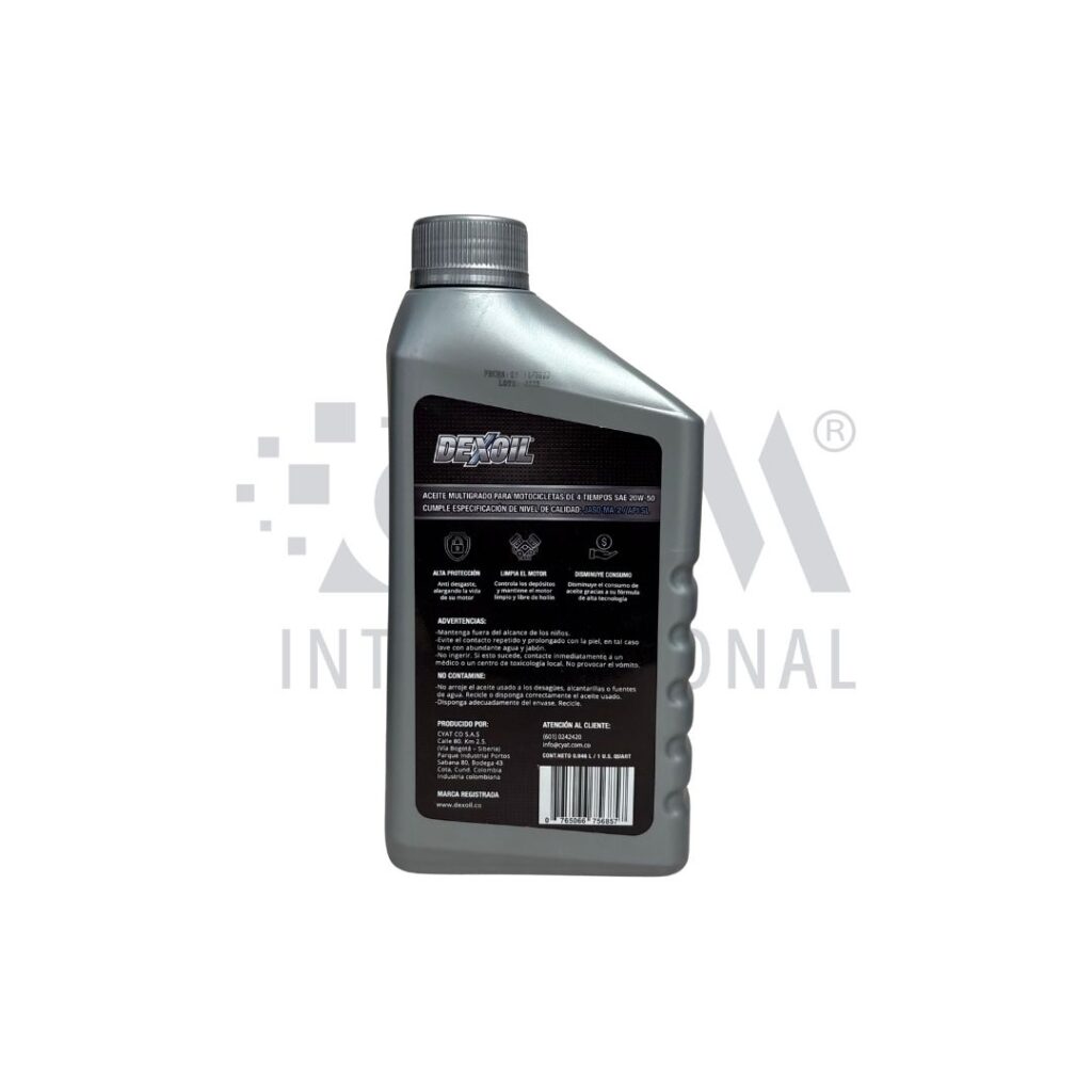 Aceite para motos 4 tiempos DEXOIL 20W-50 MA2, formulado para brindar protección confiable, excelente lubricación