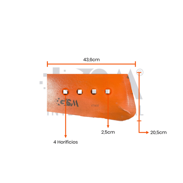Fabricada en acero al carbono de alta resistencia, soporta condiciones severas de trabajo continuo. Con dimensiones 20,5 x 43,6 pulgadas y un espesor de 1”, garantiza un ajuste preciso, alta durabilidad y excelente desempeño en aplicaciones de movimiento de tierra, construcción y minería.
