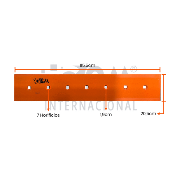 Con medidas 20.5 x 115.5 pulgadas y espesor 3/4”, esta cuchilla ofrece una excelente capacidad de corte y larga vida útil. Su diseño de 7 orificios (7H) permite un ajuste preciso y seguro al equipo, garantizando estabilidad y eficiencia durante la operación.