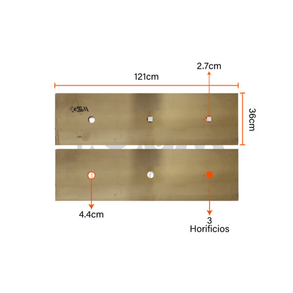 La Cuchilla de carga central 1.21 m de largo, 36 cm de ancho y 3 cm de grosor – 3H – 1″T está fabricada en acero al carbono de alta resistencia tratado térmicamente para garantizar una excelente durabilidad frente al desgaste y los impactos en operación continua.