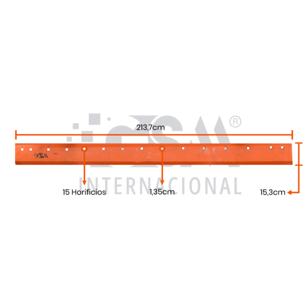 Su espesor de 3/4” la hace adecuada para aplicaciones de alta exigencia. Cuenta con dimensiones de 15,3 x 213,7 pulgadas, proporcionando amplia cobertura de trabajo, y un diseño con 15 orificios (15H) que garantiza una fijación firme y segura en la motoniveladora.