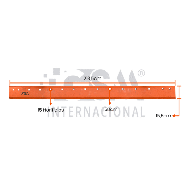 Cuenta con un espesor de 1/2” y dimensiones de 15,5 x 213,5 pulgadas, lo que permite una mayor cobertura de trabajo en aplicaciones de exigencia ligera a media. Su diseño con 15 orificios (15H) asegura una instalación firme y un ajuste preciso en la motoniveladora.