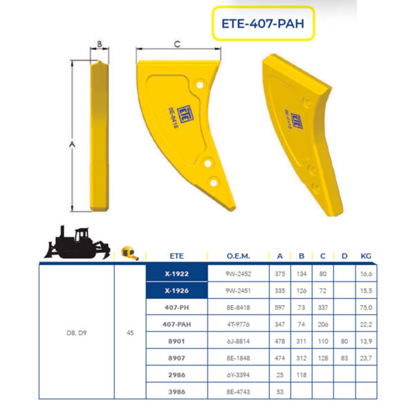La Puntera ETESA 8E-8418 está diseñada para el brazo de ripper de bulldozers Caterpillar D8 y D9, ofreciendo la máxima protección y durabilidad frente a la fricción, impacto y abrasión en operaciones de minería, canteras y movimiento de tierra.