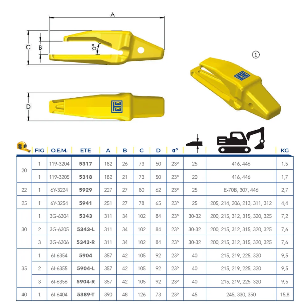 El adaptador ETESA 6Y-3224 talla 22 con base de soldar ofrece resistencia y durabilidad en trabajos de excavación livianos y medianos. Diseñado para un ajuste perfecto con dientes tipo CAT, es ideal para obras de construcción, mantenimiento vial y proyectos de infraestructura que exigen precisión y seguridad operativa.