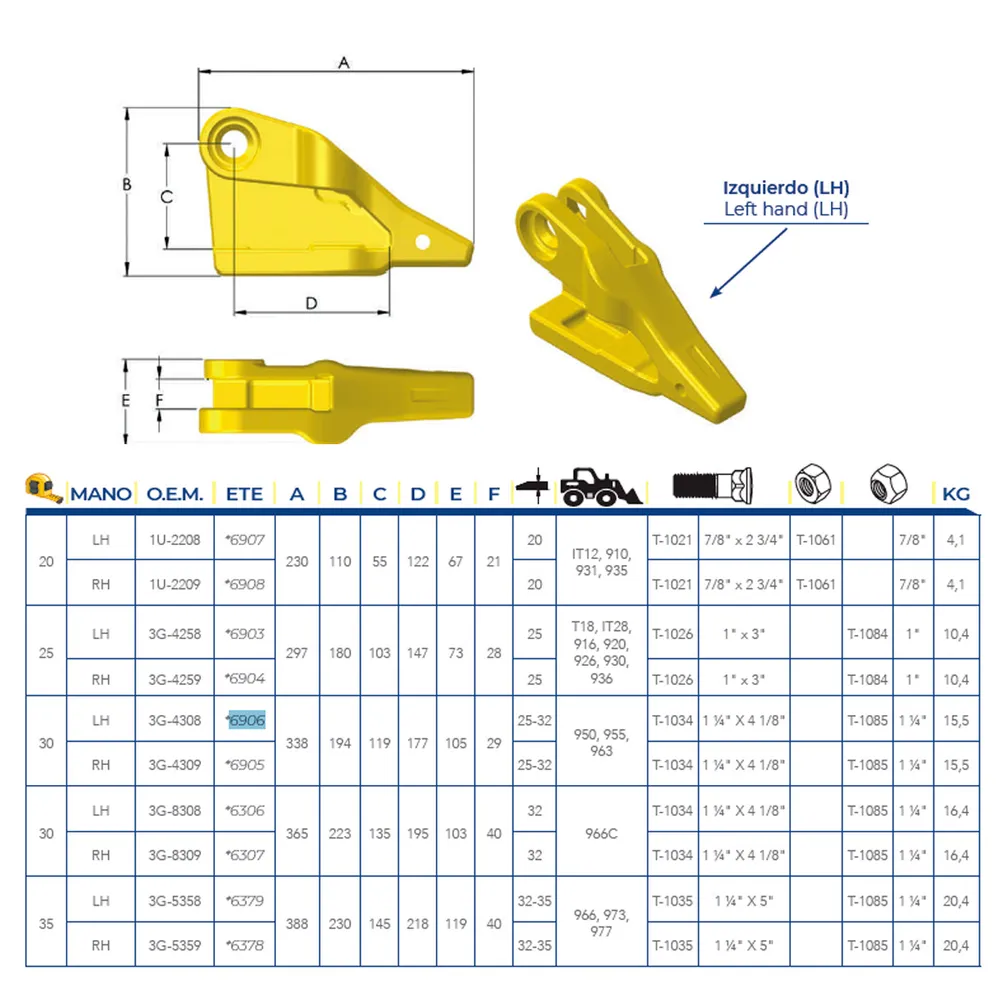 El adaptador izquierdo ETESA 3G-4309 talla 30 con base de tornillos es perfecto para cargadores en tareas pesadas. Su fijación por pernos asegura estabilidad en trabajos intensos. Compatible con dientes tipo CAT, está diseñado para ofrecer eficiencia, durabilidad y una instalación rápida en campo.