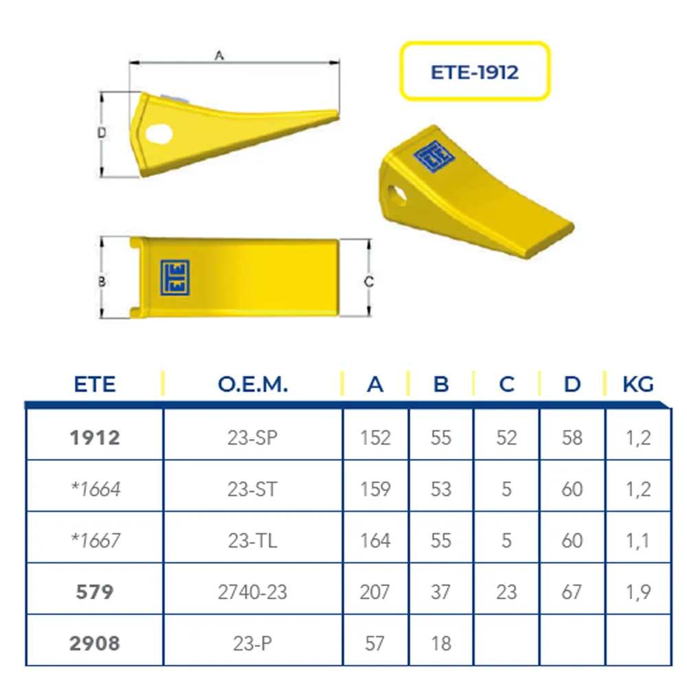 Diente ETESA modelo 23HX tipo pajarita, compatible con maquinaria Case y John Deere. Su diseño tipo H&L garantiza un ajuste firme y una alta resistencia al desgaste en aplicaciones de movimiento de tierra y carga. Fabricado en acero de alta durabilidad, ideal para retroexcavadoras y minicargadores.