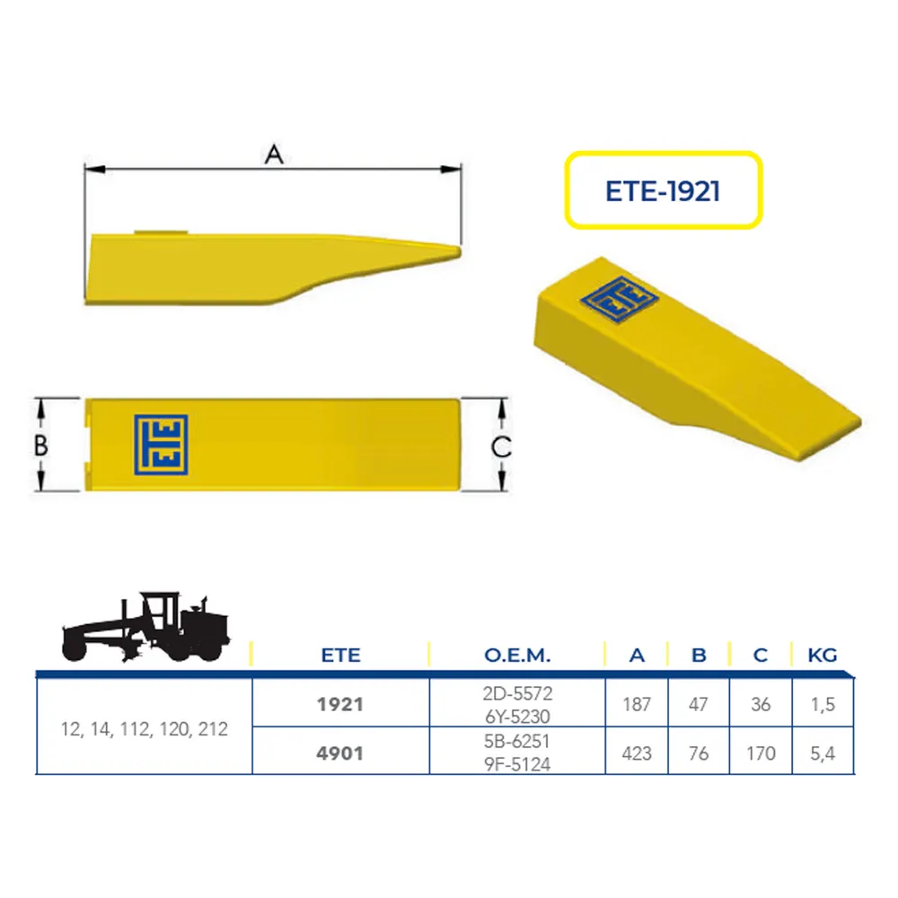 Diente ETESA escalificador para motoniveladoras CAT modelos 12, 14, 112, 120 y 212. Fabricado en acero templado para soportar condiciones de trabajo abrasivas. Ideal para cortes precisos, remoción de material duro y labores de nivelación pesada. Compatible con el soporte original CAT 6Y-5230.