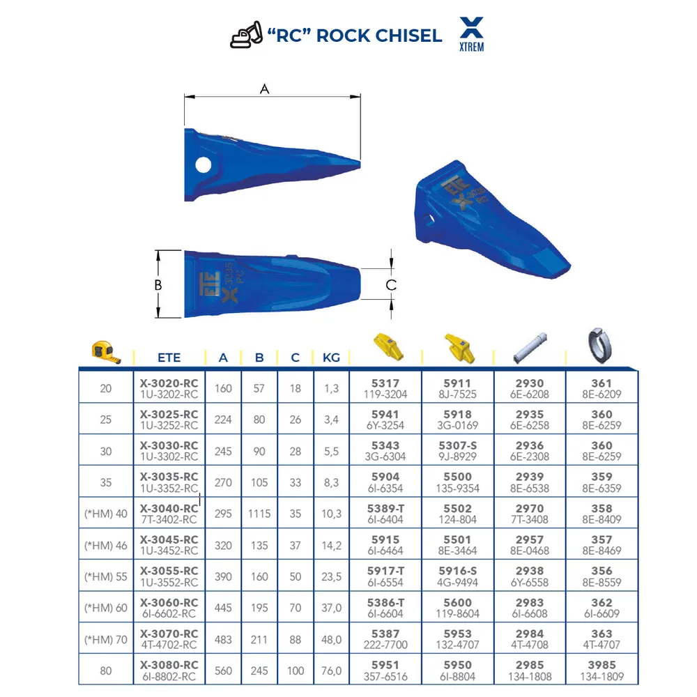 Diente Rock Chisel ETESA talla 20, modelo X-3020-RC XTREM, diseñado para romper materiales compactos y abrasivos. Su punta tipo cincel penetra eficientemente en roca y terreno duro. Fabricado para maquinaria exigente y condiciones extremas, ofreciendo gran durabilidad y resistencia al impacto.