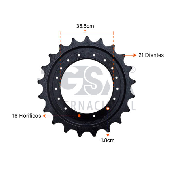 El Sprocket para excavadoras Hitachi ZX120 y ZX130 con 21 dientes y 16 huecos es un componente fundamental del tren de rodaje que transmite la potencia del motor hacia la cadena, asegurando un desplazamiento estable, suave y eficiente.