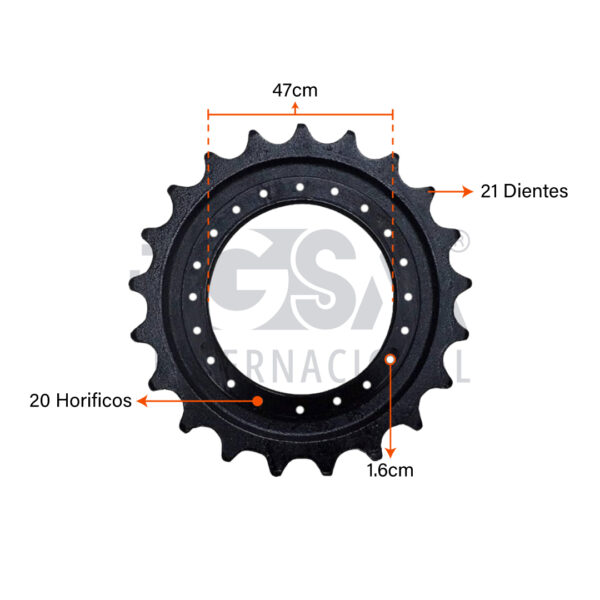 El Sprocket para excavadoras Komatsu PC200, PC210 y PC220 con 21 dientes y 20 huecos es un componente fundamental del tren de rodaje, encargado de transferir la potencia del motor hacia la cadena, asegurando desplazamiento firme y estable en cualquier terreno.