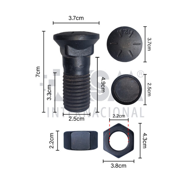 El Tornillo y tuerca de cuchilla 1” x 2 3/4” – 25mm x 50mm – 38mm copa cuadrado es un repuesto esencial para la fijación segura de cuchillas en equipos de movimiento de tierra.