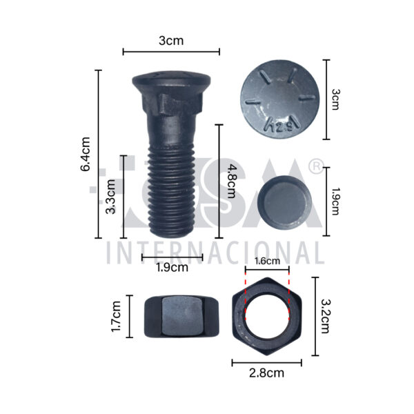 El Tornillo y tuerca de cuchilla 3/4” x 19mm x 64mm – cuadrado es un repuesto fundamental en el sistema de fijación de cuchillas para equipos de movimiento de tierra.