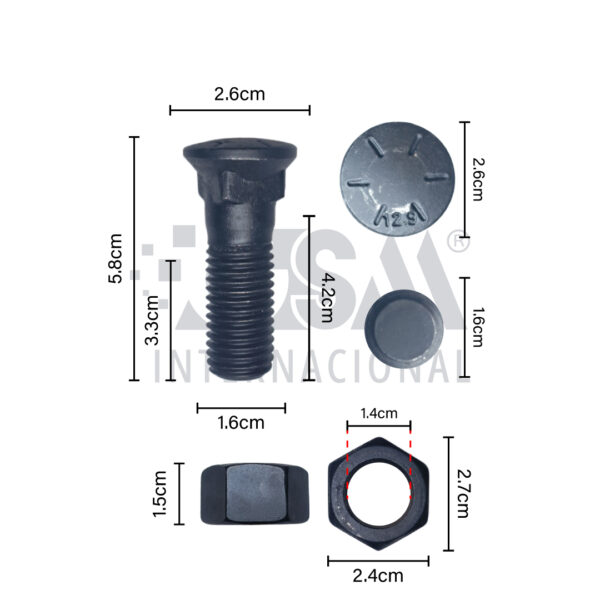 El Tornillo y tuerca de cuchilla 5/8” x 2 1/4” – 16mm x 57mm – cuadrado es un repuesto esencial para asegurar cuchillas de corte en equipos de movimiento de tierra de rango medio y liviano.