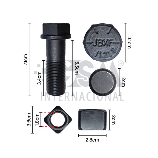 El Tornillo y tuerca de zapata 3/4” x 19mm x 56mm x 27mm copa es un componente esencial en el tren de rodaje de excavadoras Caterpillar 320 y Hitachi ZX200. Su función principal es fijar las zapatas a la cadena de la oruga, permitiendo que la máquina trabaje de manera estable en terrenos exigentes y bajo cargas pesadas.