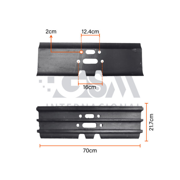 La Zapata de oruga para excavadoras PC210, 690ELC, EC240, R200 y ZX200, con medidas 700mm de ancho, 10mm de espesor, pernos de 20mm y 4 orificios de fijación, es un componente clave del tren de rodaje que brinda apoyo, tracción y flotación en distintas condiciones de trabajo.